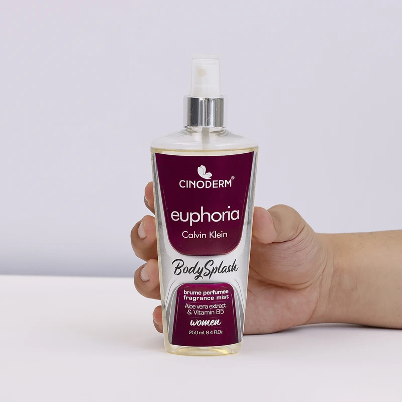 در ساختار بادیاسپلش عطری سینودرم از آب دیونیزه، الکل شیرین، عطرهای طبیعی و ترکیبات آبرسان پوست (گلیسیرین و آلوئهورا) استفاده شده است. این محصول به عنوان خوشبوکننده، به صورت مستقیم روی پوست بدن استفاده میشود. پس اگر میخواهید به جای داشتن لباسهای خوشبو، پوست بدنتان معطر باشد، از این محصول استفاده کنید. بادیاسپلش زنانهی کلوین کلاین مدل یوفوریا بوی شیرینی دارد که باعث آرامش و شادی میشود. رایحهاش حس آرامش و خلسه به شما میدهد، خلسهای که میتواند برای به خواب رفتن در آخر شب، تمرکز بهتر حواس یا فراموش کردن مشکلات زندگی به کار رود. مناسب تمامی فصول، بخصوص فصول معتدل سال مثل بهار و اوایل پاییز است. بادیاسپلشهای عطری سینودرم با آبرسانی مناسب، موجب شفافیت، نرمی و شادابی پوست میشود.همچنین حاوی دکسپانتنول (پرو ویتامین B5) هستند و میتوانند در اگزماها و درماتوزهای خفیف، باعث تسریع در بهبود زخم و تسکین خارش شوند. گرچه به لحاظ ساختاری کمی شبیه به اسپریهای خوشبو کننده هستند، اما مانند اسپریها، در ترکیبات آنها از گاز استفاده نشده است. به همین دلیل میزان پخش بوی خوش بعد از استفاده از آنها به نسبت اسپریهای خوشبو کننده، کمتر است. همچنین نسبت به ادکلنها درصد اسانس کمتری دارند و به همین دلیل حساسیت کمتری ایجاد میکنند و به راحتی روی پوست اسپری میشوند، البته پراکندگی به مراتب کمتری نسبت به ادکلنها دارند و از لحاظ اقتصادی هم قابل مقایسه با یکدیگر نیستند. بهتر است بلافاصله بعد از استحمام درحالیکه پوست بدن هنوز مرطوب است مقدار مناسبی از محصول را روی پوست اسپری نمائید.