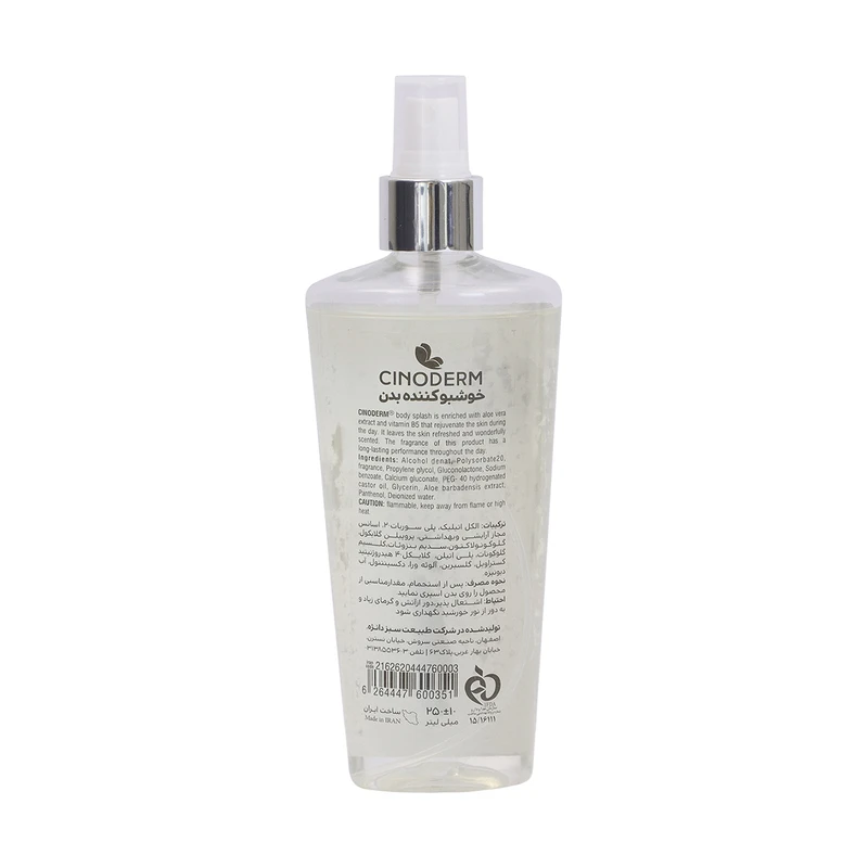 در ساختار بادی‌اسپلش عطری سینودرم از آب دیونیزه، الکل شیرین، عطرهای طبیعی و ترکیبات آبرسان پوست (گلیسیرین و آلوئه‌ورا) استفاده شده است. این محصول به عنوان خوش‌بوکننده، به صورت مستقیم روی پوست بدن استفاده می‌شود. پس اگر می‌خواهید به جای داشتن لباس‌های خوش‌بو، پوست بدنتان معطر باشد، از این محصول استفاده کنید.