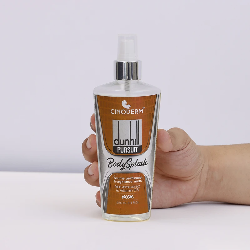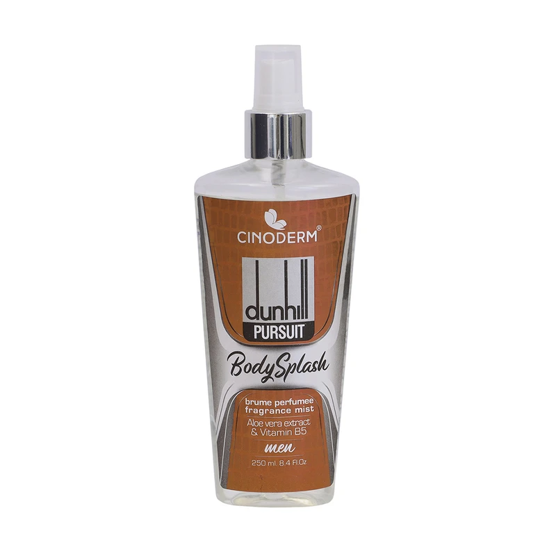 بادی اسپلش مردانه سینودرم مدل Dunhill Pursuit حجم 250 میلی‌لیتر ترکیب رایحه‌هایی مانند چوب صندل، عنبر، مشک، سدر و نارنج باعث شده رایحه دانهیل پرسوئیت به سمت شرقی و چوبی سوق پیدا کنه و بخاطر گرمی و تلخی خاصی که داره مناسب آقایان هست. بادی‌اسپلش‌های عطری سینودرم با آب‌رسانی مناسب، موجب شفافیت، نرمی و شادابی پوست می‌شود. همچنین حاوی دکسپانتنول (پرو ویتامین B5) هستند و می‌توانند در اگزماها و درماتوزهای خفیف، باعث تسریع در بهبود زخم و تسکین خارش شوند. گرچه به لحاظ ساختاری کمی شبیه به اسپری‌های خوش‌بو کننده هستند، اما مانند اسپری‌ها، در ترکیبات آن‌ها از گاز استفاده نشده است.